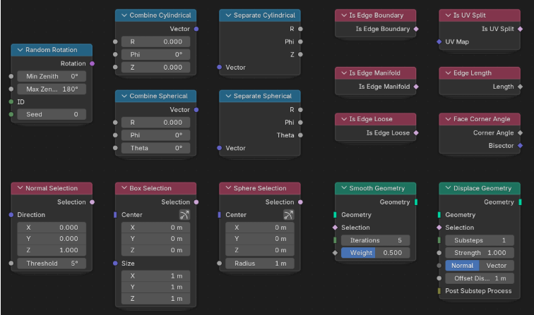 原生支持体素网格操作,新增网格插槽及专用节点矩阵。从存储/获取命名网格到SDF/密度生成,再到体素化网格稀疏度优化与网格转换,形成完整体素处理链路。配套分析节点(卷曲/发散/拉普拉斯等)与滤镜(平均曲率/SDF圆角等)构建专业级体素工具链,流体对流网格更支持速度场驱动体素运动。
