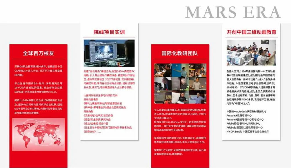 当多数人尚不知“CG”为何物时,火星时代的前身——1994年成立的“王琦电脑动画工作室”已扬帆起航。同年出版的《三维动画速成》,如同星火点燃中国CG教育燎原之势。从“分享技术”的初心起步,火星时代始终肩负“帮助更多人实现梦想”的使命,30年来融汇全球前沿技术,携手国内外顶尖企业,持续为影视、游戏、元宇宙等数字创意产业输送实战精英。选择火星时代,即是选择与行业脉搏同频共振的起点。