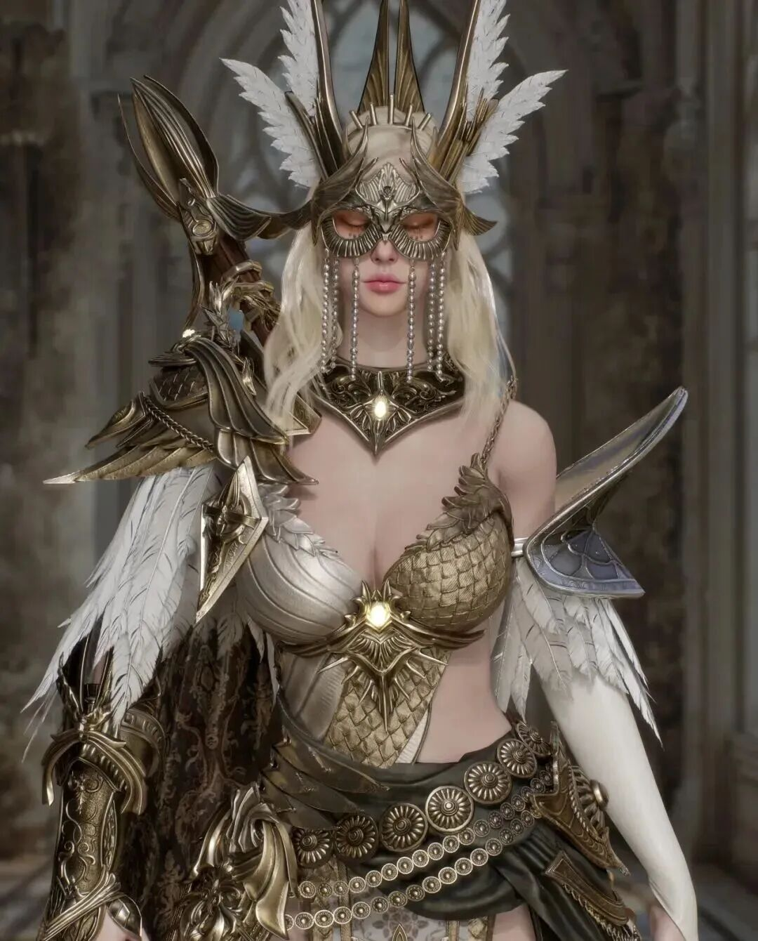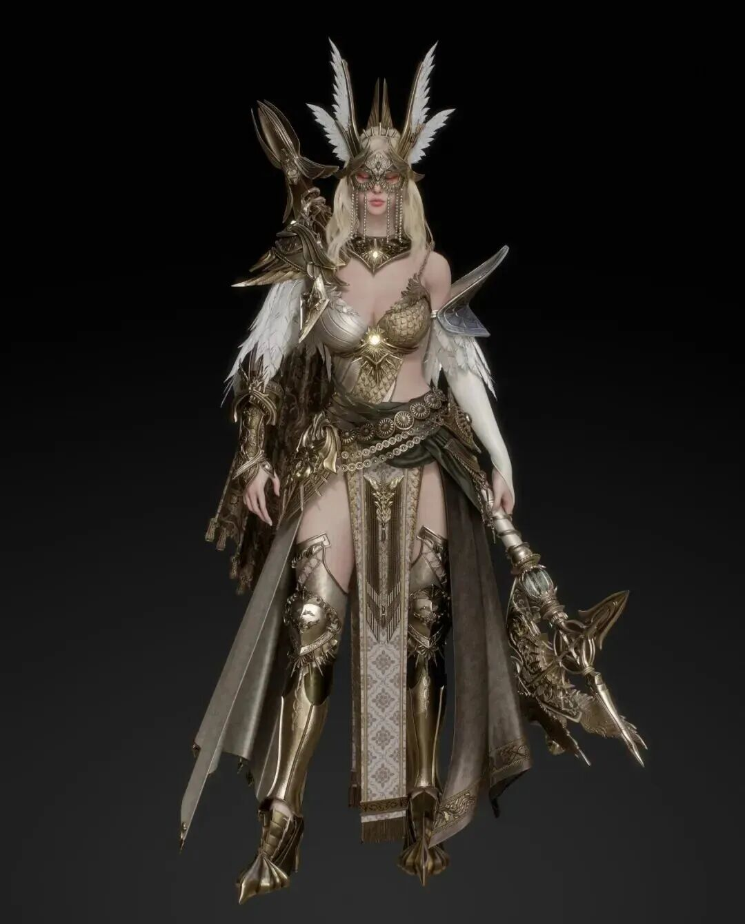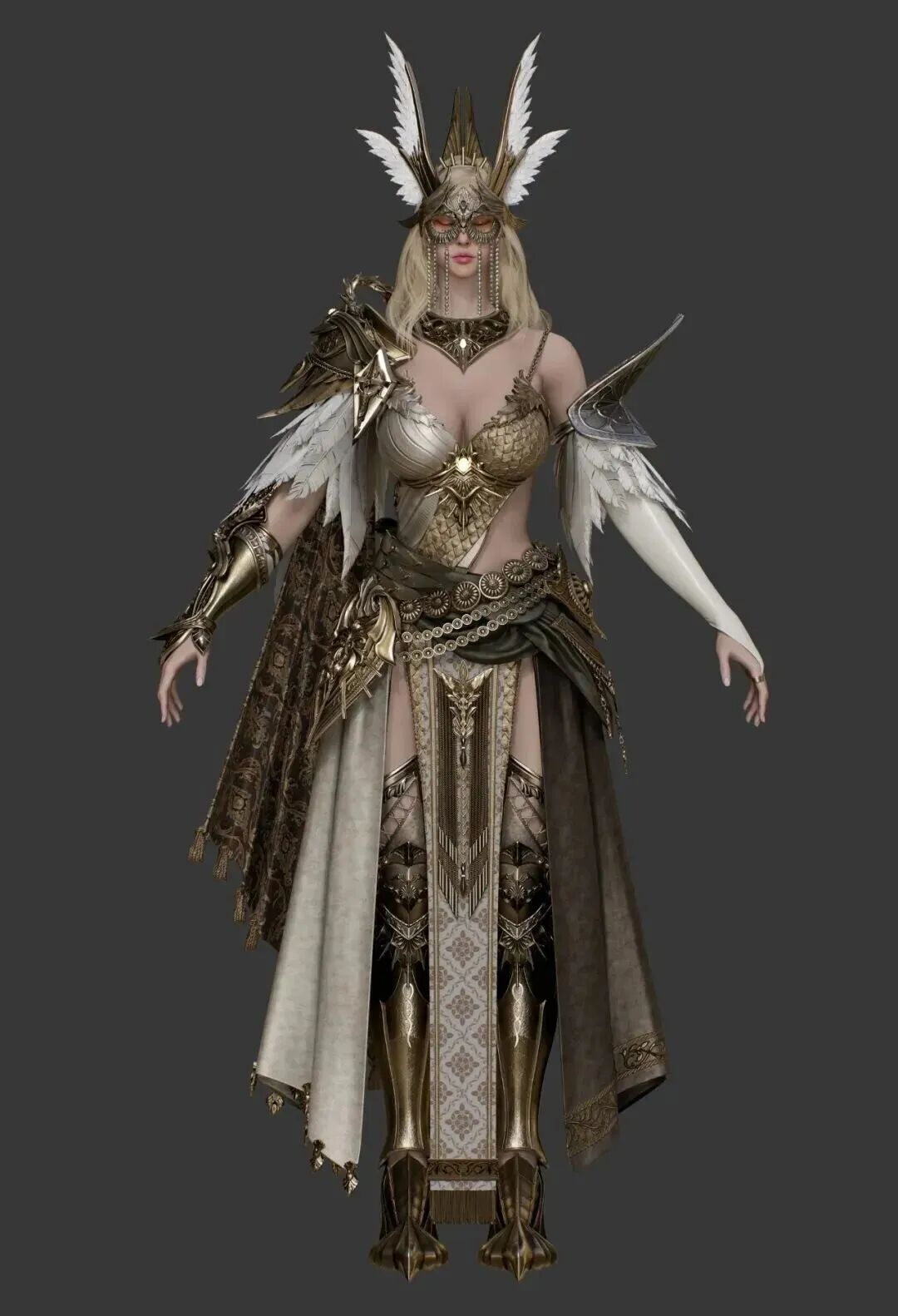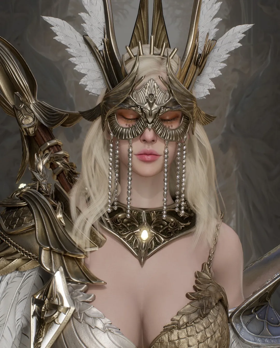 作品核心亮点在于铠甲设计的跨文化融合美学。金属铠甲采用欧洲骑士盔甲的硬朗轮廓,表面通过精密雕刻呈现冷冽的金属质感;而羽毛装饰与不对称腰饰则注入东方幻想的灵动韵律,形成力量与优雅的视觉平衡。腰带上繁复的浮雕纹样与珠链面饰的东方元素叠加,在强化奇幻史诗氛围的同时,巧妙构建出文化符号的层叠叙事。