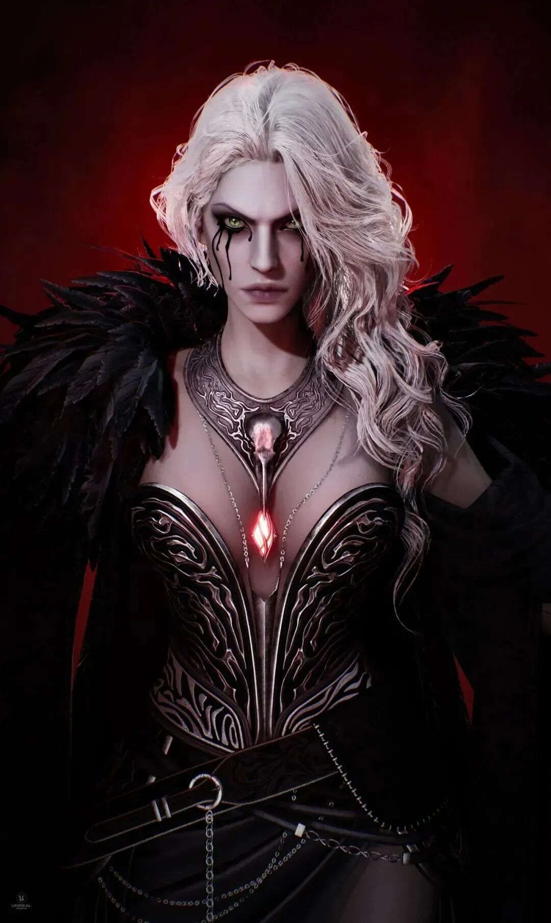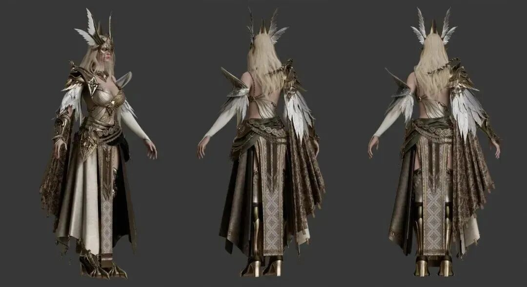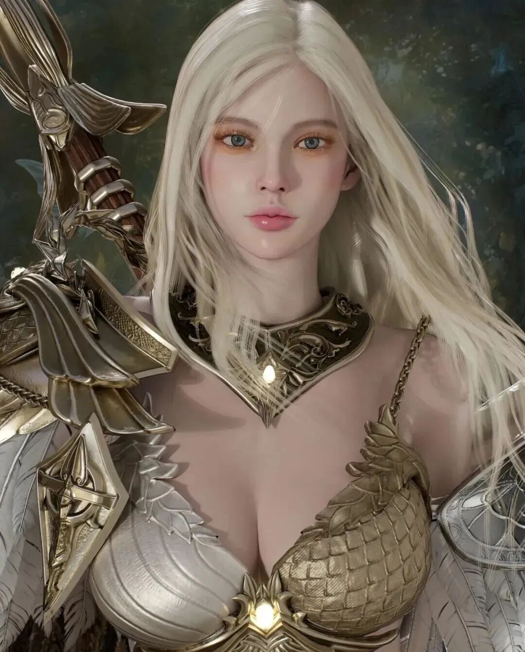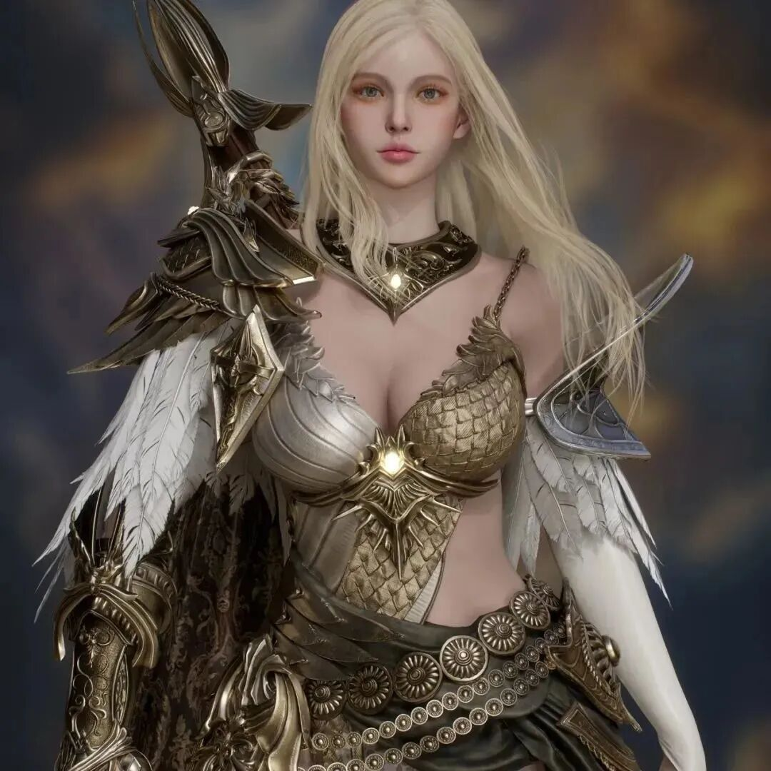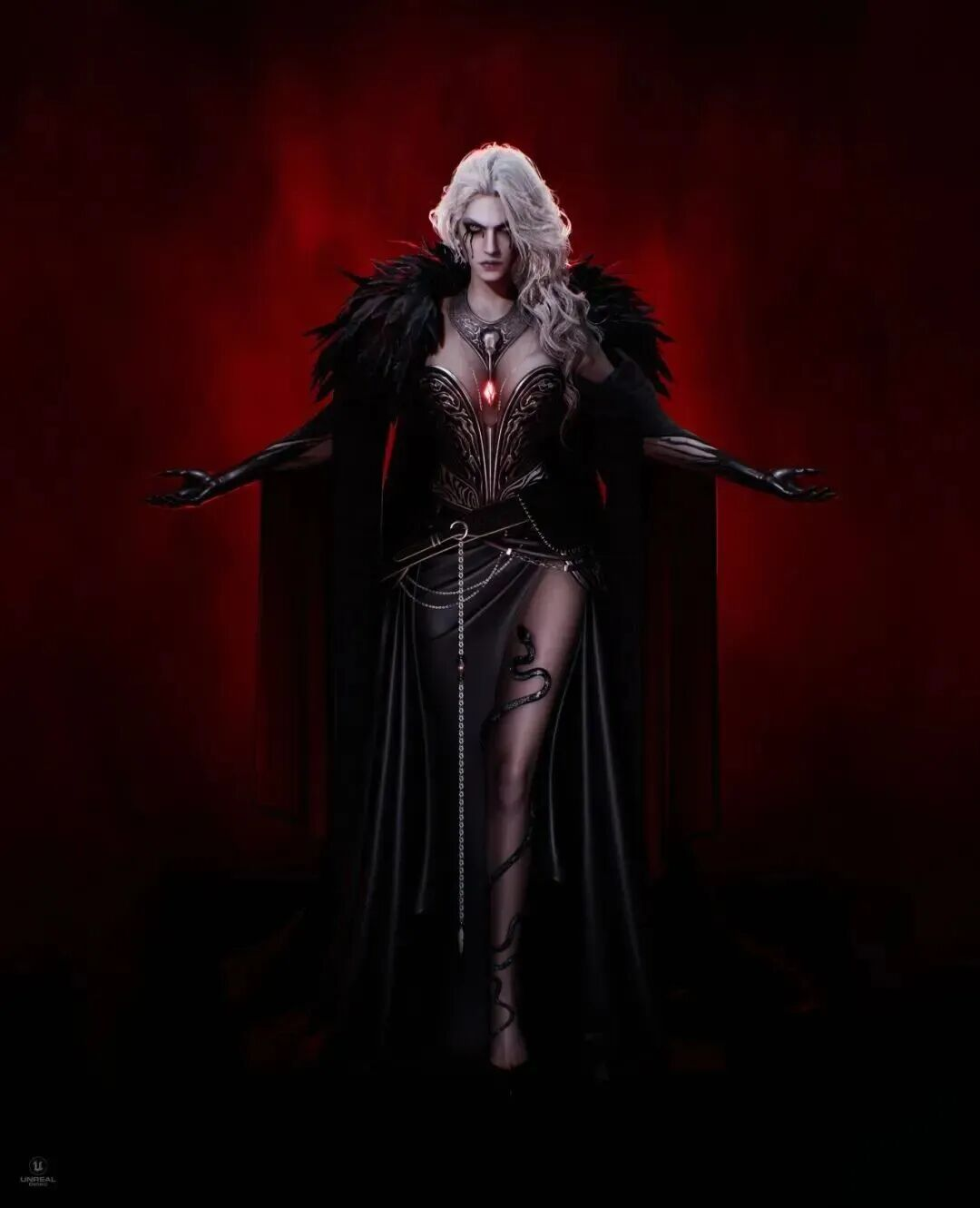 作品核心亮点在于铠甲设计的跨文化融合美学。金属铠甲采用欧洲骑士盔甲的硬朗轮廓,表面通过精密雕刻呈现冷冽的金属质感;而羽毛装饰与不对称腰饰则注入东方幻想的灵动韵律,形成力量与优雅的视觉平衡。腰带上繁复的浮雕纹样与珠链面饰的东方元素叠加,在强化奇幻史诗氛围的同时,巧妙构建出文化符号的层叠叙事。