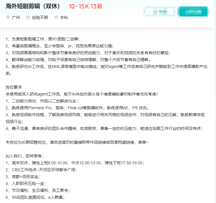 另外,还有一些公司会将AI工作流写进招聘需求中,能用AI工具完成素材制作会酌情优先考虑。