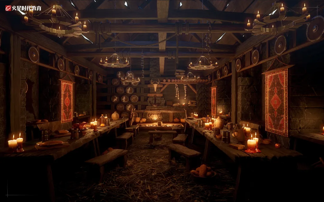由于是夜晚的室内场景,而场景内只有烛火与炭火的地方能发出光芒,我们打了两盏橘黄暖光的主光源和两盏淡蓝冷光的主光源与四十多盏点光源,并对光源的颜色不断修改调整,让光源与场景融合在一起。