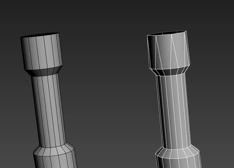 低模的制作比较简单,在max中在中模基础上减面和优化布线就能得到低模了。需要思考在面数和高低模匹配度上做取舍,比如圆柱两端的圆形可以给不同的段数,能够看到的一段多给段数,而穿插进去一段减少段数。