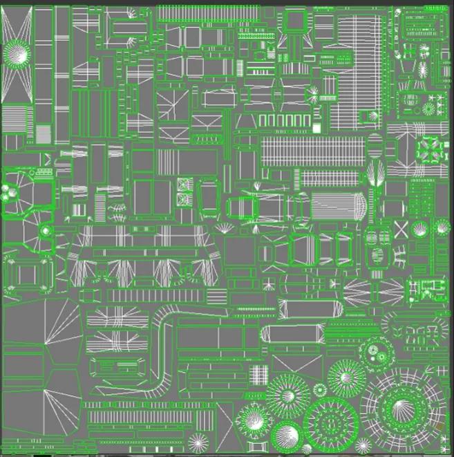 拓扑完成之后便是展UV了。由于大家是分工合作,难免会出现UV大小不统一的情况,所以说在展UV之前,还有一件重要的事情要完成,那就是确定像素精度。通过一个相同的像素精度,来确定各个组员自己制作的物品到底需要多少张UV,从而使整个场景的像素精度统一。