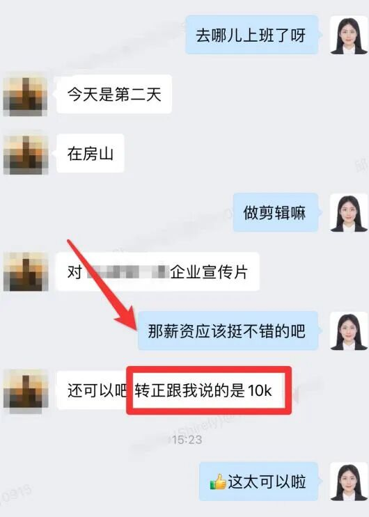 另一位剪包班的毕业生,去了之前进班招聘的公司,主要接企业宣传片,顺利转正的话能开到10k~!