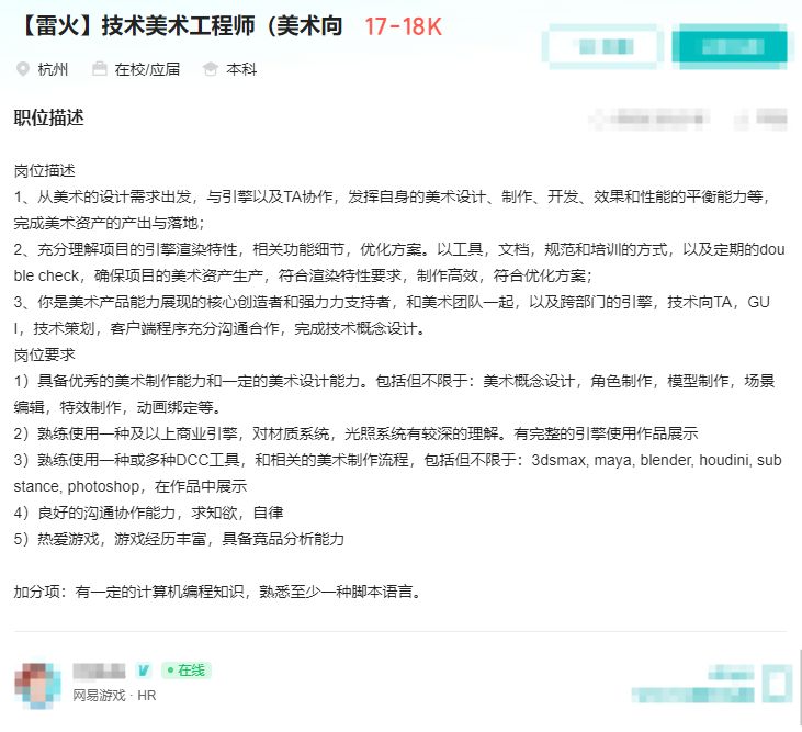 以下是网易雷火工作室美术向技术美术工程师的招聘需求,“有编程知识、熟悉至少一种脚本语言”成为明确加分项。