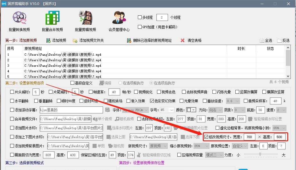 这里用“修改视频尺寸”这个选项来实现视频尺寸的批量修改,只要勾选一下这个剪辑的选项,然后调整需要修改的宽度和高度,调整好就可以开始剪辑视频了。