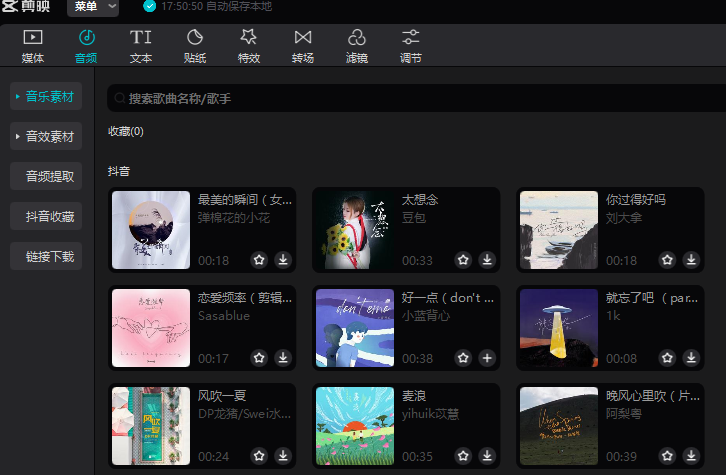 音频里有素材、提取音频,还有音频的特效素材。文本可以输入文字,也可转成语音,非常方便。