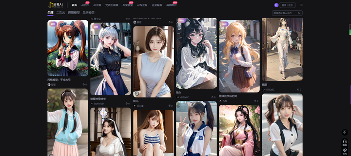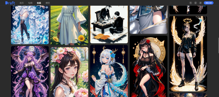 Draft提供海量瀑布流素材,让你无限获得灵感。首页分为绘图、社区和模型三个版块。类似于stable diffusion的云端部署,可在线进行创作。