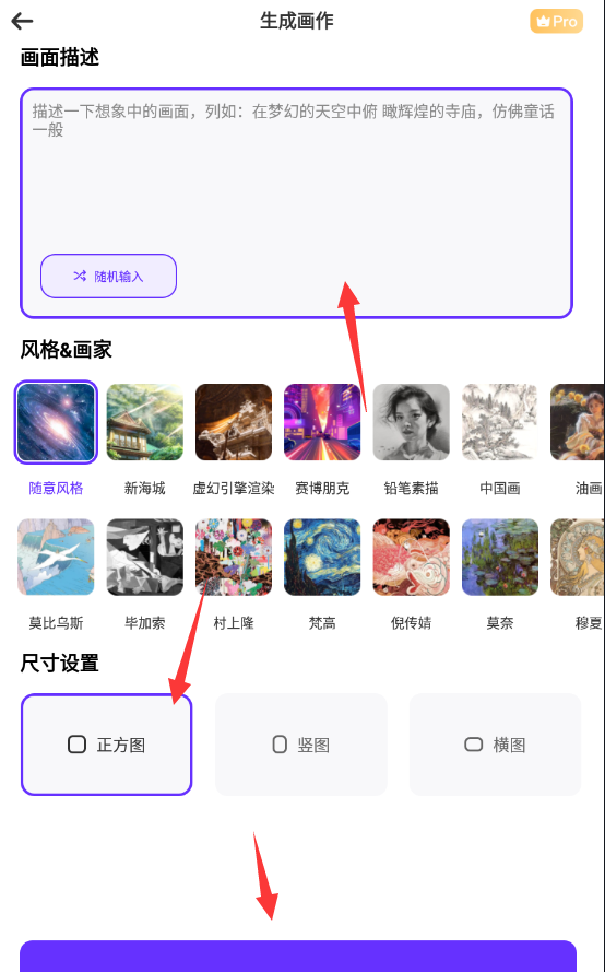 该软件采用了文字描述的绘画方式,非常适合新手。只需输入您的想法,选择所需的画面和风格,然后点击生成按钮即可。在输入文字时,请提供关键词、人物和场景的具体描述。