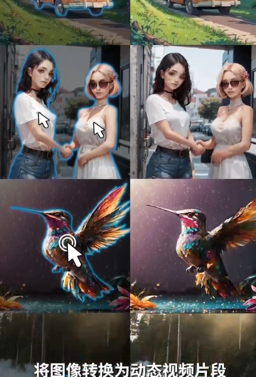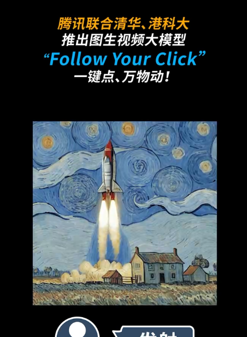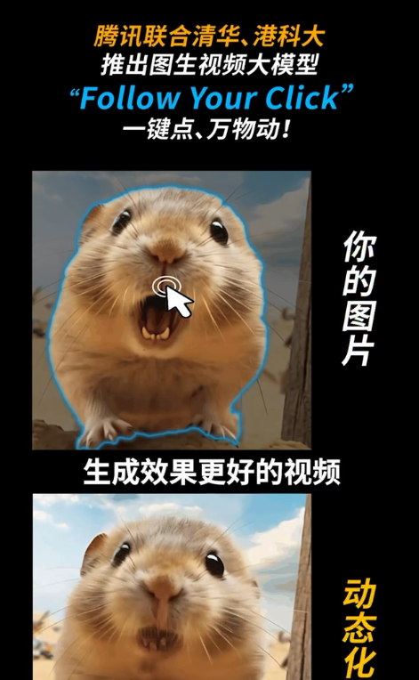 腾讯和清华大学、香港科技大学联合推出一项名为“Follow-Your-Click”的全新图生视频模型,在这一模型中用户只需点击图片中的某个区域并提供少量提示词便可将图片变成视频,让静态的画面活起来。