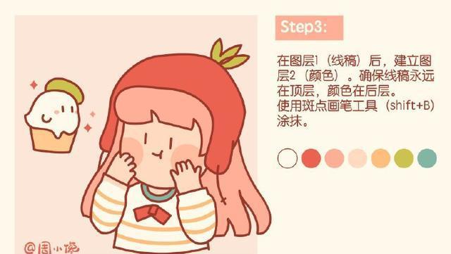 在图层1 (线稿)后,建立图层2 (颜色),确保线稿永远在顶层,颜色在后层。使用斑点画笔工具(shift+B)涂抹。