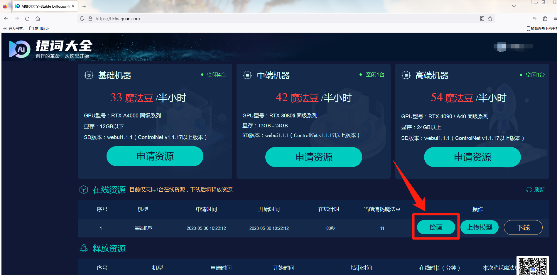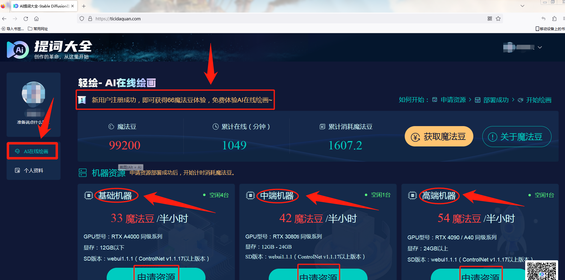 接着,点击【AI在线绘画】,首次登录即可获得66个魔法豆,免费体验绘画。在页面上选择适合自己需求的机型资源。