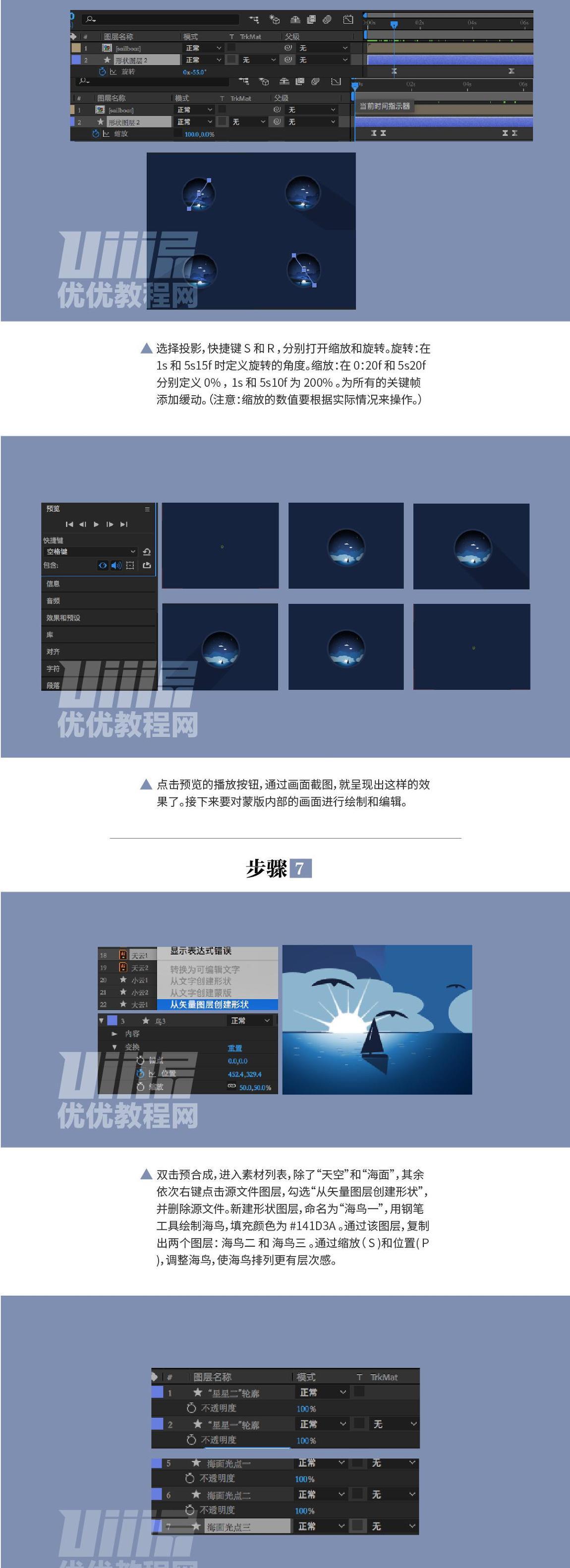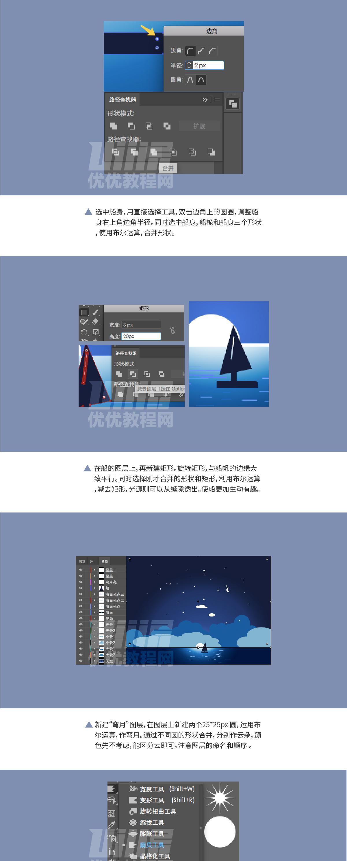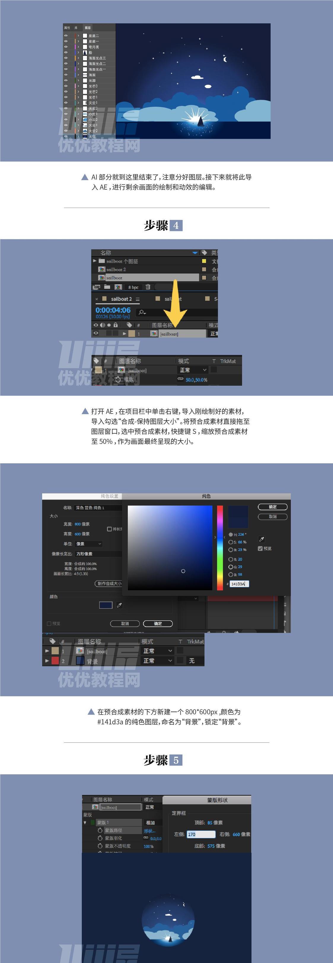 原图作者的场景构建和光影切换非常巧妙,并没有过多复杂的动效,却通过动静结合、虚实对比,给人带来了奇特的视觉享受。本次教程将分享如何运用AI常用工具和AE中的蒙版、图层技巧,创作出有趣的夜航动画。