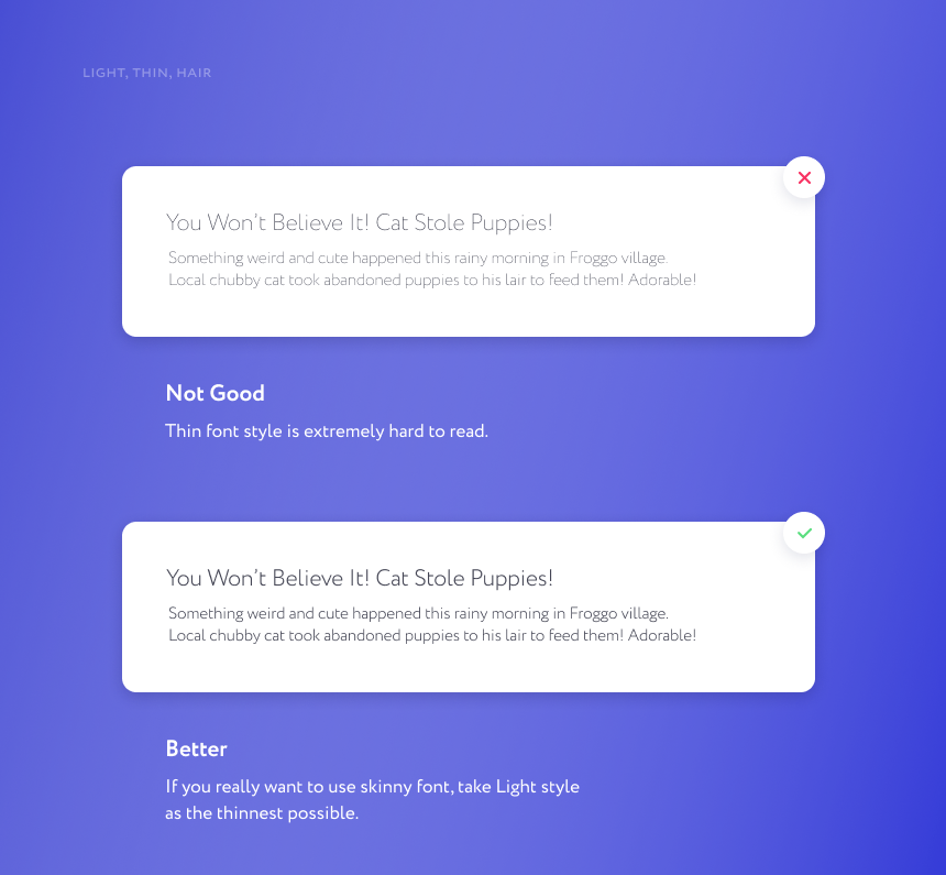 字重超细的字体要谨慎使用。可以使用浅色,但是要根据字体情况进行选择。如果你设计的文本是装饰性也就算的,如果是需要用户能清晰阅读的,就要特别慎重,能不用就不用,否则在部分手机屏幕上看起来会非常糟糕。