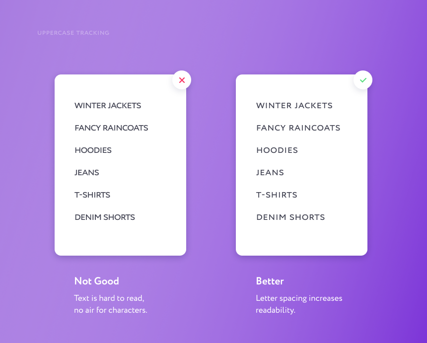 纯大写的字母文本,要额外拉开字母之间的字间距,提升可读性。