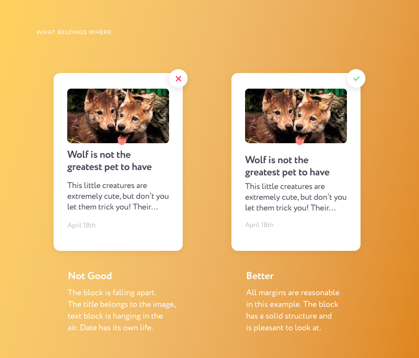 边距有助于从视觉上来判断元素之间的亲疏关系。标题和文本应该是一组,这一组和图片、日期的距离更远一些。