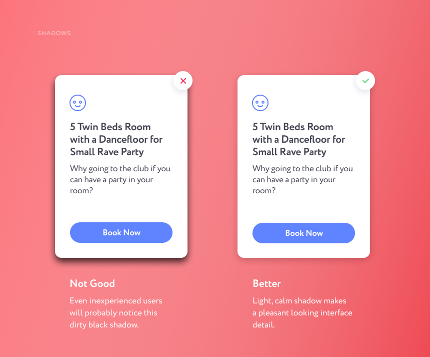 元素下方的阴影一定不要用黑色。选择阴影的颜色和明暗应基于表层的、前景的元素。通常,一个小且明确的阴影,位于正下方,另外一个阴影模糊且弥散,透明度更高。