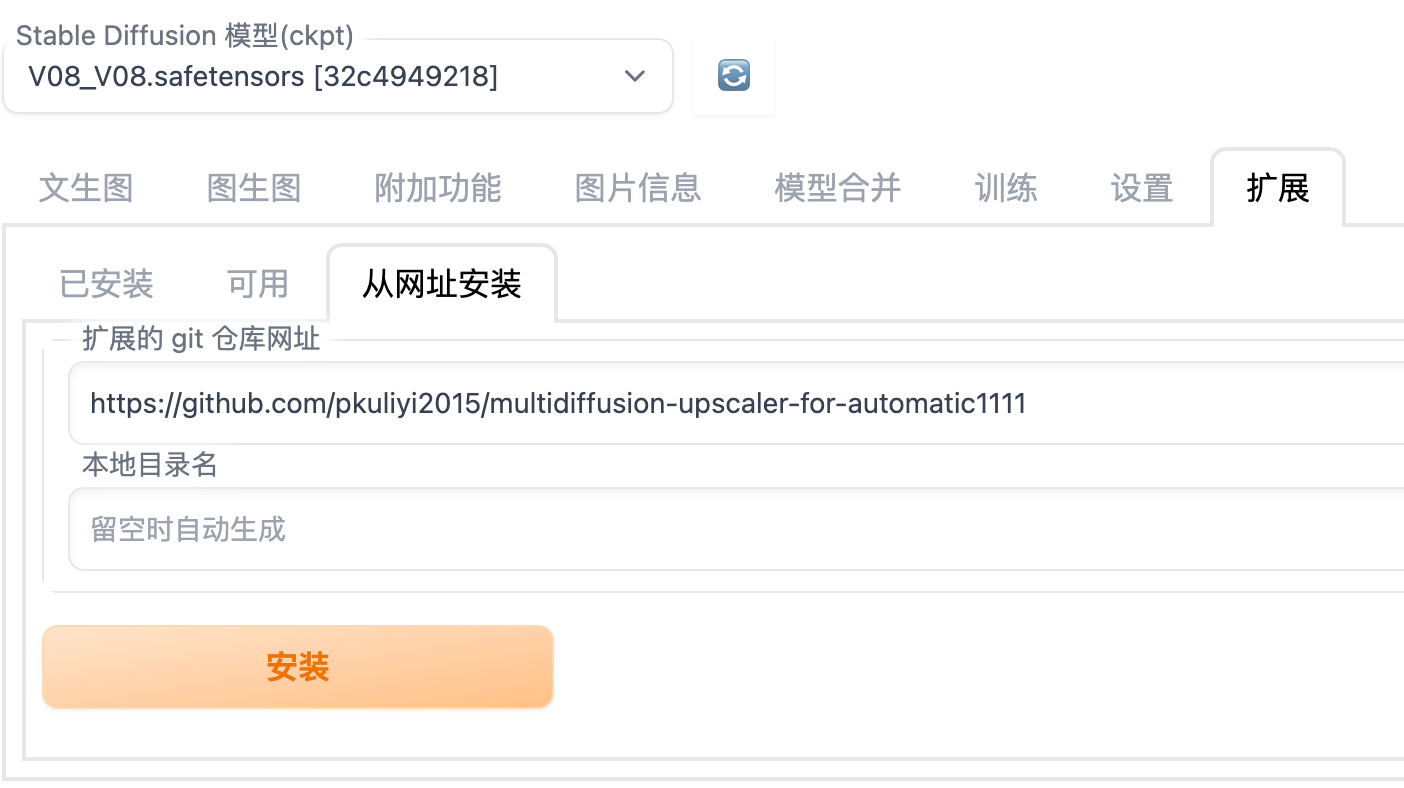 https://github.com/pkuliyi2015/multidiffusion-upscaler-for-automatic1111 点击“安装”,国内网络不稳定时,在kgithub下载安装。