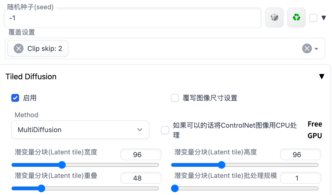 安装插件后,打开“启用”即可使用默认设置。如图一样分块融合生成图像,可调节块的大小和重叠数量提高生成速度。