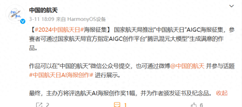 参赛者生成作品后,可通过“中国的航天”微信公众号提交,或在微博@中国的航天并使用话题 #中国航天日AI海报创作# 参与作品展示。海报征集活动将持续2周,截止日期为2024年3月24日。