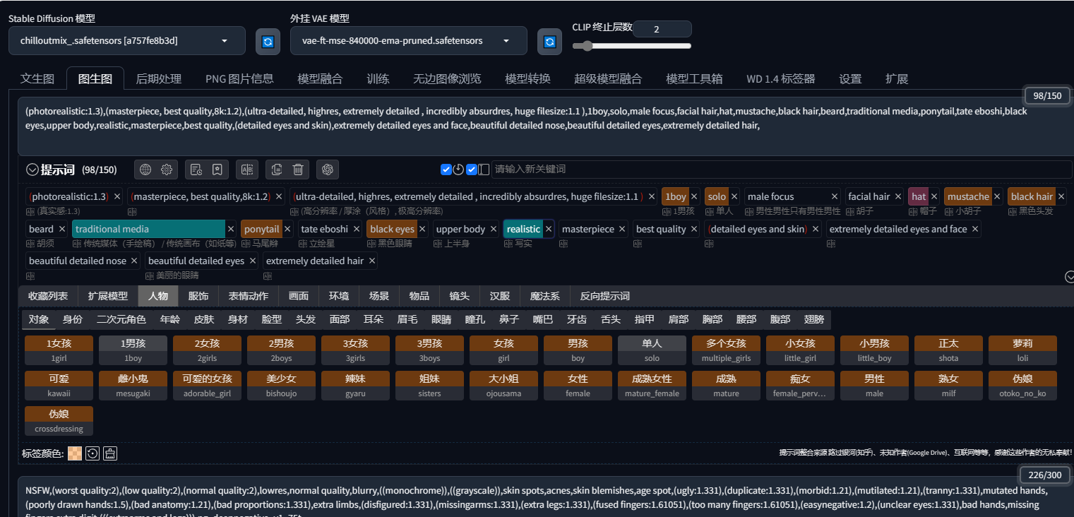 正向提示词:(照片真实感:1.3),(杰作,最好的质量,8k:1.2),(超细节,高层,非常详细,难以置信的荒谬,巨大的文件大小:1.1 ),1男孩,独奏,男性焦点,面部毛发,帽子,胡子,黑头发,胡子,传统媒体,马尾辫,tate-eboshi,黑眼睛,上身,逼真,杰作,最好质量,