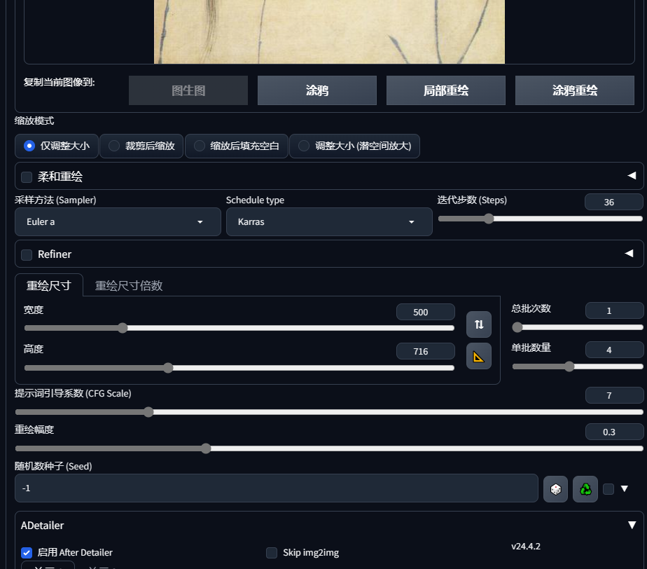 提示词引导系数和重绘强度默认就可以,后续处理需要调整这两个参数,现在先不动。重绘强度现在用0.3,越大与原图越不像,但越象真人。