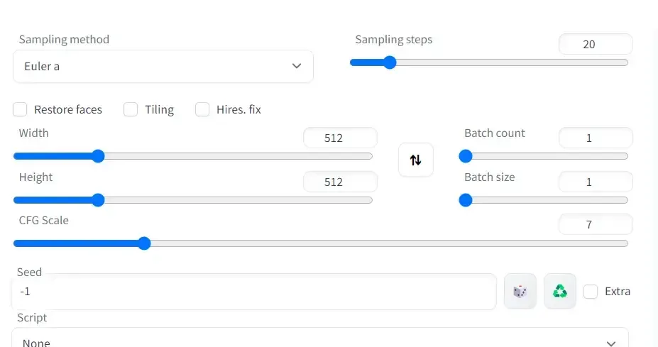 选择Sampling方法时一般选择DPM++,设定Steps(迭代步数)约20左右,其他参数根据需求设置。想要图片更清晰可以打开Hires.fix(高清修复),Count(生成次数)和Size(生成张数)视需求设定哦。