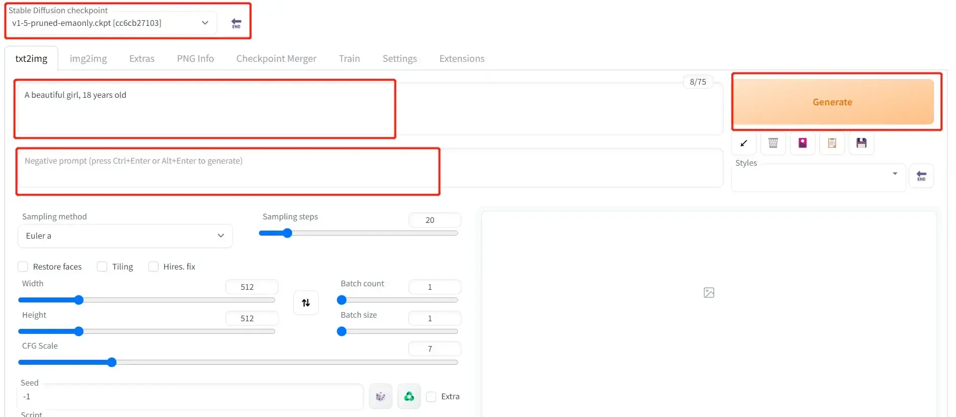 文生成图只需要在Prompt写下提示词及反向提示词(不希望出现的内容)。