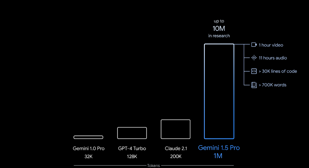 谷歌近日发布了其最新的人工智能模型Gemini 1.5。这一新版本的最大亮点在于,作为首个登场的多模态通用模型,Gemini 1.5 Pro把稳定处理上下文的上限扩大至100万tokens。这意味着Gemini 1.5 Pro能一次性处理超过70万个单词的文本、3万行代码、11个小时的音频,或1个小时的视频。相较之下,两个月前发布的Gemini 1.0 Pro上下文理解限制为3.2万tokens,而OpenAI的GPT-4 Turbo也只支持12.8万tokens。