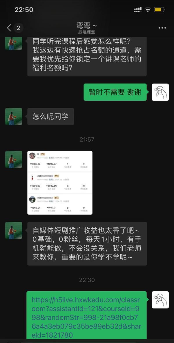 在一次免费的自媒体变现直播课中,主播宣称正在运营某省级卫视的官方账号,承诺加入即享私人福利和免费视频素材等待遇。课程只招收8名学员,学费4980元,提供多对一保姆式服务,保证月入过万,无收益可全额退款,并额外奖励5000元。课程结束后,记者发现另一机构的直播中同样出现相同的主播和宣传词。