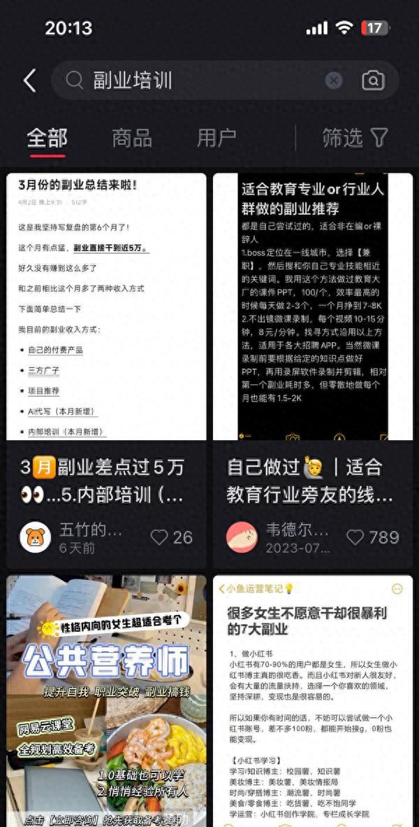在各种平台上搜索“副业培训”,许多博主通过“亲身经历”介绍各种上手快、变现容易的副业,表述个人可观收入,暗示副业市场大有可为。一些求职者在推荐副业的帖子下留言“求带”,显示出对副业的渴望。