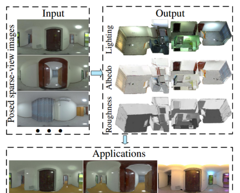 而如视团队本次开创性提出面向真实室内场景的多视角逆渲染框架,可基于精准的空间数据,反向推测获取对诸如光照、反射率、粗糙度等场景内在属性,在三维重建的基础上恢复出贴近真实场景的光照和材质表现,在重建效果、成本效率、应用范围等维度实现全面提升。