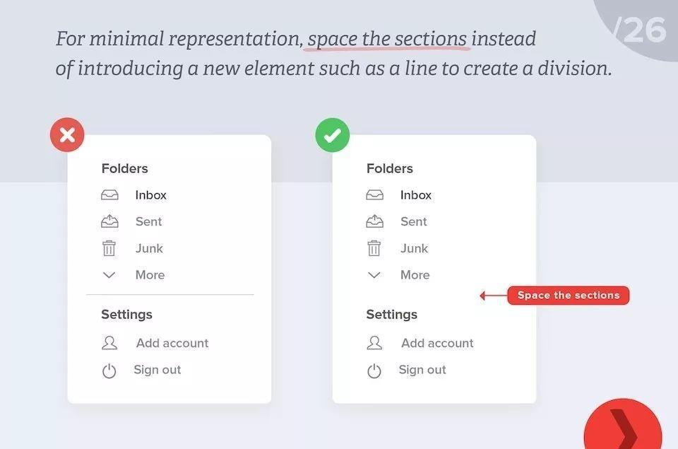 26.少即是多,将设计的布局空间化,而不是引入一个新元素(如一条线)来创建一个分区。
