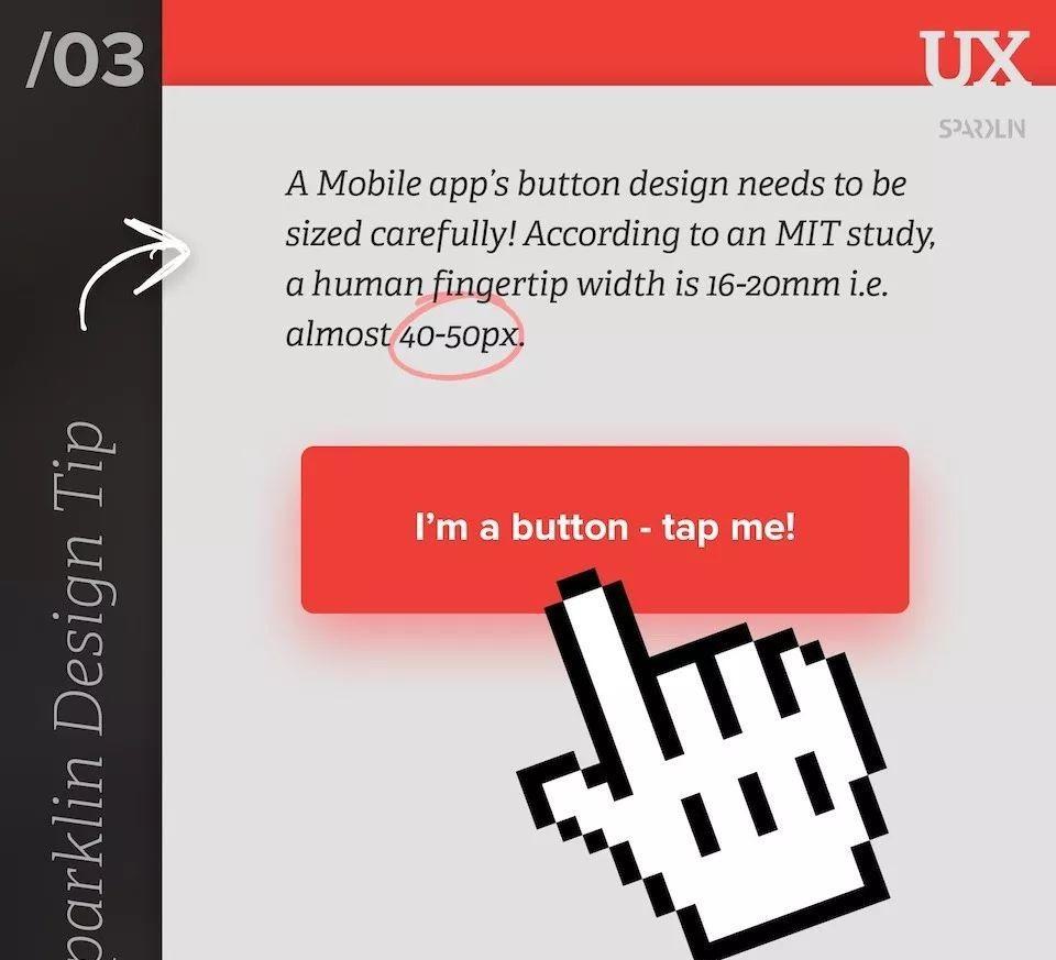 03.手机应用程序的按钮设计需要仔细调整其比例大小。根据最新2024的研究,人类指尖的宽度为16-20毫米,差不多40-50px.