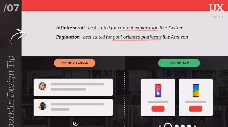07.无限滚动——更适合像Twitter这样的内容探索;分页——最适合像Amazon这样的目标导向平台。