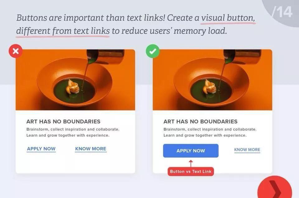14.按钮比文本链接更重要!创建一个可视按钮会更优于文本链接,以减少用户的记忆负荷。