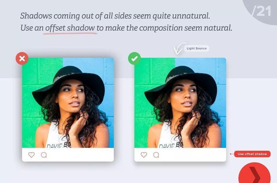 21.从四面八方投射的阴影很不自然,使用偏移阴影让设计看起来自然。