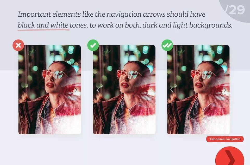 29.导航箭头等重要元素应具有黑白色调,适用于黑暗和浅色背景。