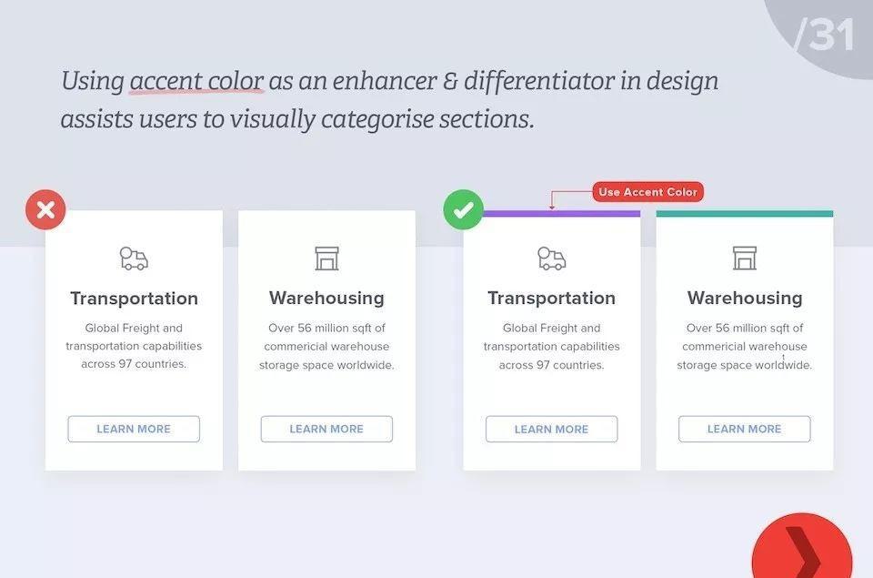 31.使用强调色作为设计中的增强器和区分器,会更有助于用户对信息内容进行可视化分类。