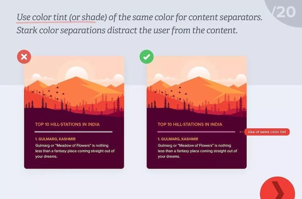 20.使用相同颜色的色调(或阴影)分隔内容信息。鲜明的颜色分隔会分散用户对内容的注意力。