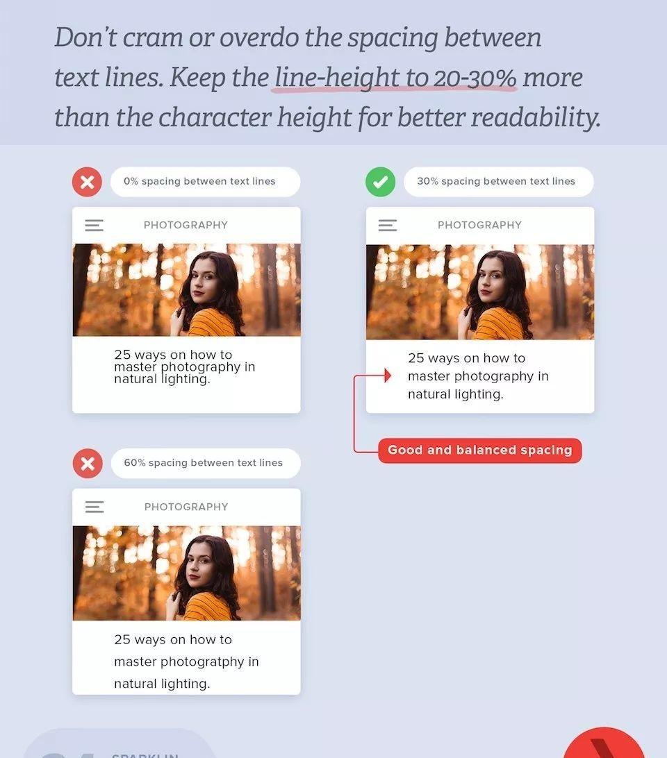 34.不要填充或覆盖文本行之间的间距。保持行高比字符高度多20-30%,以提高可读性。