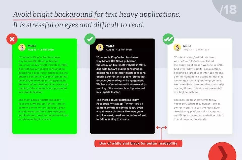 18.对于文本最深的应用程序,使用明亮的背景色会对眼睛有压力导致很难阅读。