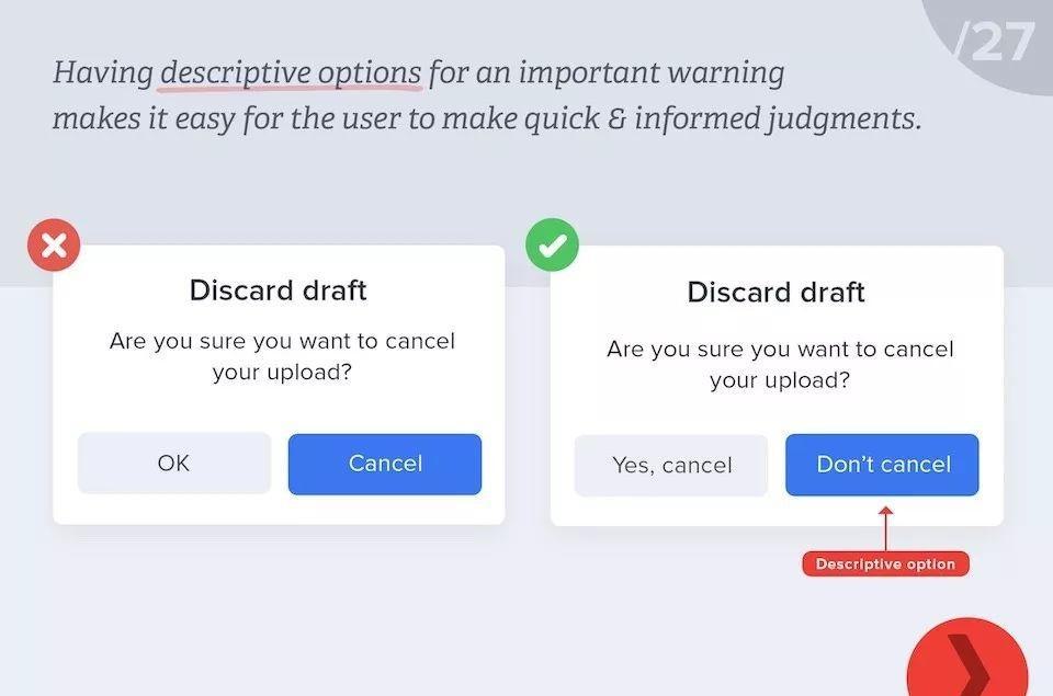 27.具有重要警告的描述性选项的设计可以让用户轻松做出快速明智的判断。