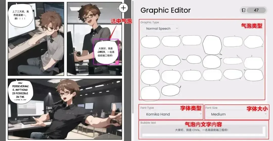 点击气泡内容,可以在 "Graphic Editor" 自订气泡形状、文字、字体、字号等。