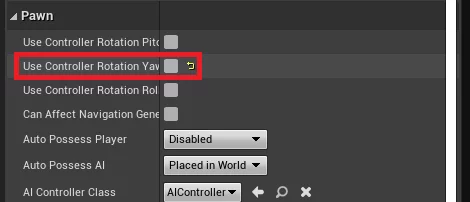 在 Pawn 部分,取消勾选“Use Controller Rotation Yaw”。