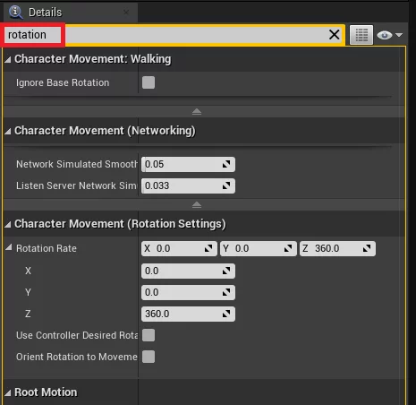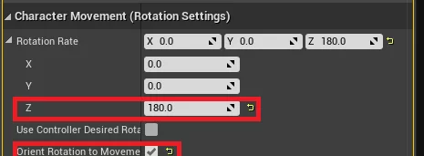 在 Character Movement Rotation Settings 选项卡中,将 Z Rotation Rate 值设为180,并勾选“Orient Rotation to Movement”框。