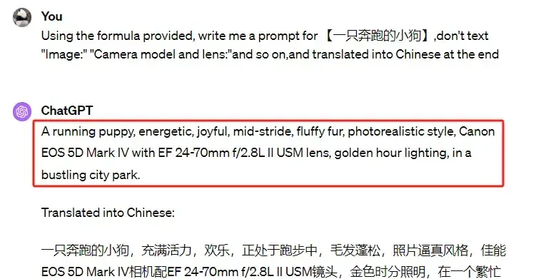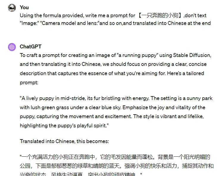 例如,希望ChatGPT生成“一只奔跑的小狗”的指令,就可以向ChatGPT提出这样的要求。