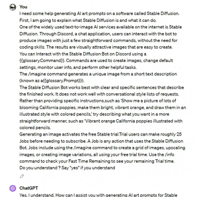 将Stable Diffusion的指令传达给ChatGPT,训练其理解Stable Diffusion的关键词逻辑和写法。