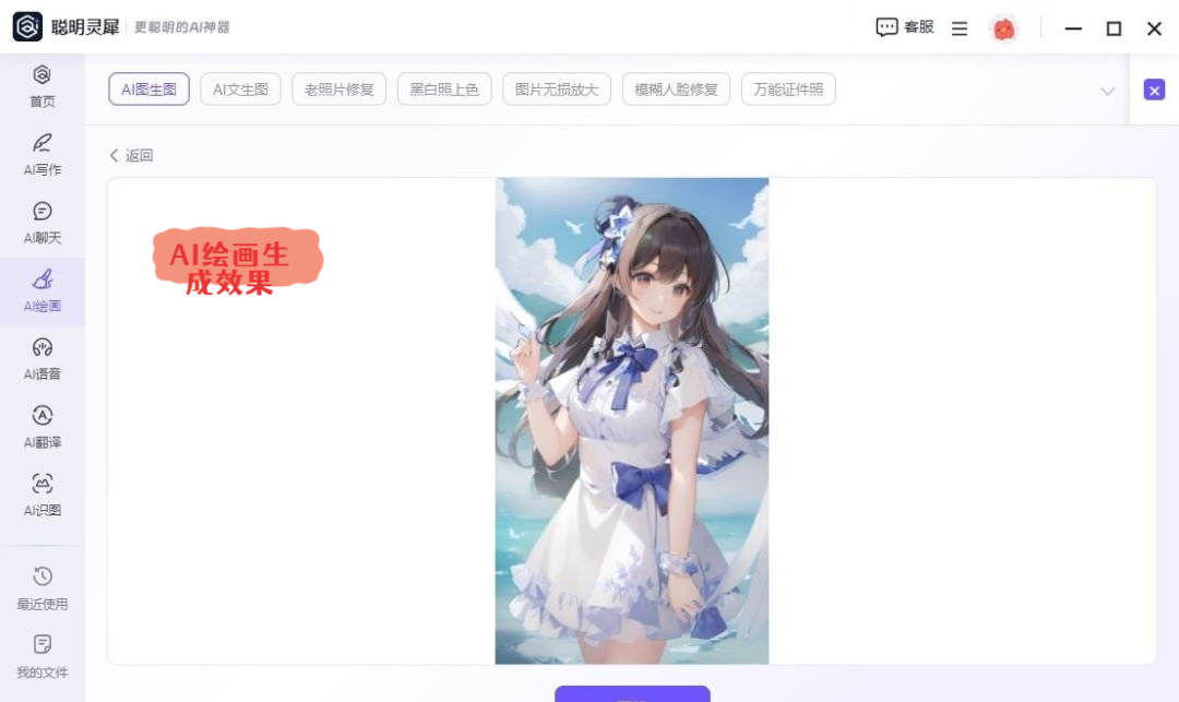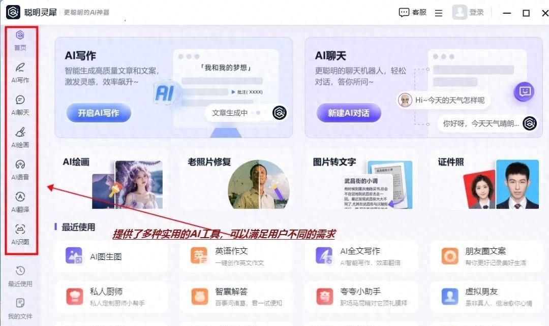 这是一款专业的AI工具,内置AI绘画、AI聊天、AI写作、AI翻译等功能,可以满足用户不同的处理需求哦!